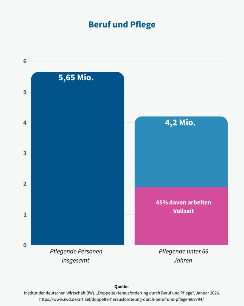 Nach Auswertungen des Institut der deutschen Wirtschaft pflegten insgesamt rund 5,65 Millionen Menschen andere Personen, etwa Angehörige oder Freunde. Das zeigen entsprechende Daten für das Jahr 2022 im Kontext Beruf und Pflege aus dem Sozio-oekonomischem Panel (SOEP). Von diesen Menschen befanden sich etwa 4,2 Millionen in einem Alter unter 66 Jahren und mussten ihre Pflegetätigkeit daher parallel zur Erwerbsarbeit leisten. Das zeigt: Pflege ist kein Randphänomen des Ruhestands, sondern betrifft vor allem das aktive Erwerbsleben großer Bevölkerungsgruppen. Bei den 18- bis unter 50-jährigen Pflegenden waren rund 75 Prozent erwerbstätig und arbeiteten im Durchschnitt 35 Stunden pro Woche. Gleichzeitig wendeten sie an jedem Werktag im Schnitt rund drei Stunden für Pflegetätigkeiten auf. Diese Doppelbelastung aus Erwerbsarbeit und Pflege ist damit nicht nur zeitintensiv, sondern berührt unmittelbar die Lebensrealität vieler Beschäftigter.