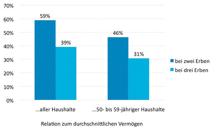 Bei einem Gesamtvermögen aller privaten Haushalte von gut elf Billionen Euro wechseln damit drei von zehn Vermögens-Euro ihren Besitzer. Davon werden 2,1 Billionen Euro an die nächste Generation übertragen. Fast jede zweite generationenübergreifende Erbschaft wird Immobilien enthalten, deren Wert allein sich auf 0,9 Billionen Euro summiert. Wie die großen Vermögen konzentrieren sich auch die großen Erbschaften auf wenige Fälle. Die oberen zwei Prozent aller Hinterlassenschaften vereinen etwa ein Drittel des gesamten Erbschaftsvolumens auf sich.