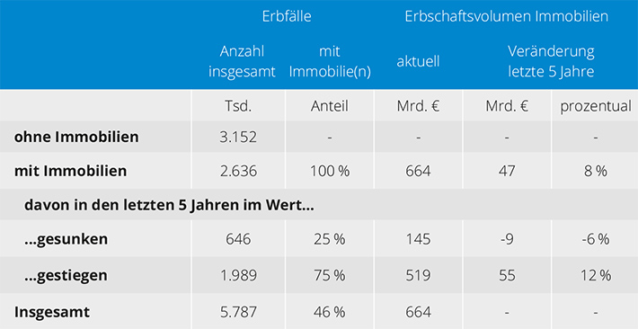 Immobilien bestimmen zudem maßgeblich die Erbschaftshöhe: Wenn Immobilien zum Nachlass gehören, dann wird in der Regel auch deutlich mehr Geld vererbt. Immobilienlose Erbschaften sind dagegen in jedem vierten Fall „wertlos“. Werden dagegen Immobilien vererbt, dann beträgt der Nachlass meist mehr als 150.00 Euro. Während in den alten Bundesländern mehr als die Hälfte aller Erbschaften eine Immobilie umfasst, trifft das im Osten nur in einem von drei Erbfällen zu. Allerdings läuft die Angleichung bereits auf vollen Touren: vor 15 Jahren waren noch vier von fünf ostdeutschen Erbfällen immobilienlos.
