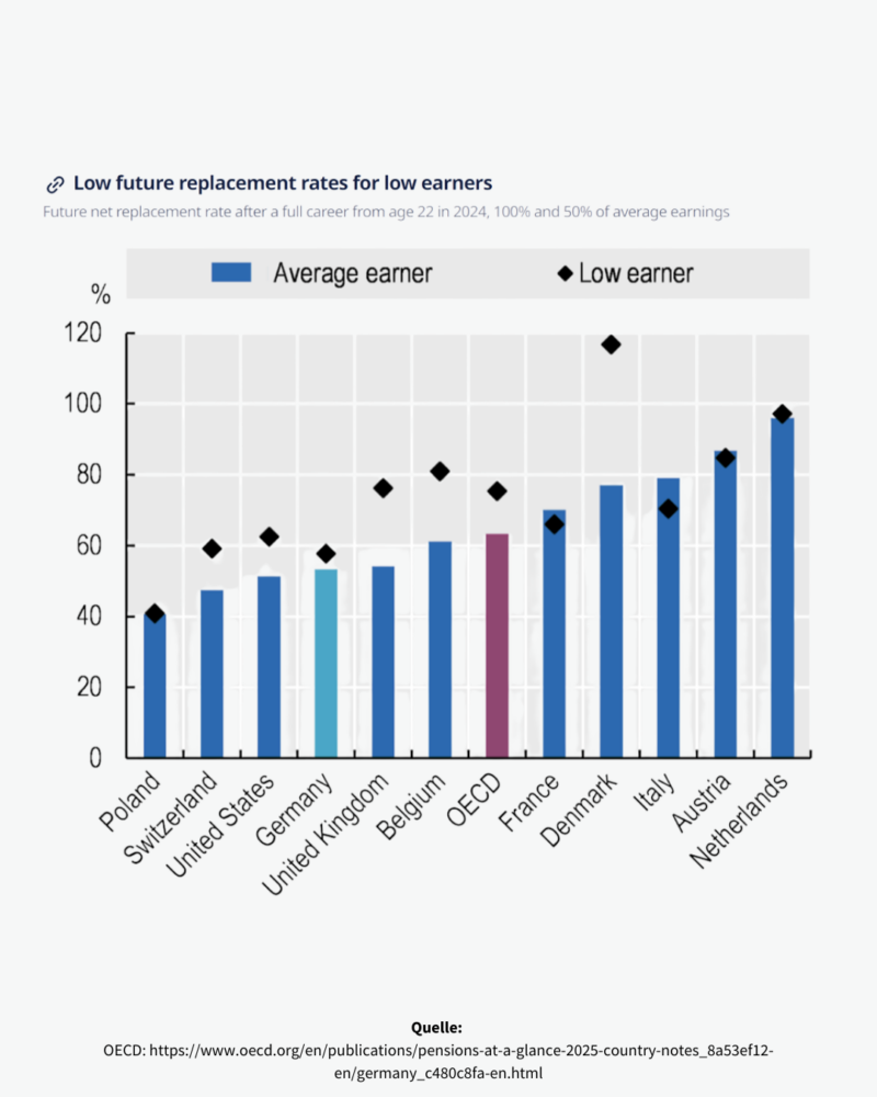 Der spezifische Deutschland-Part zeigt: Für künftige Durchschnittsverdienende ergibt sich eine Nettoersatzquote von 53,3 Prozent – klar unter dem OECD-Mittel. Mit angenommener freiwilliger Vorsorge von vier Prozent des Einkommens steigt die Quote auf 68,0 Prozent. Deutschland weist im Vergleich eine geringe Umverteilung zugunsten niedriger Einkommen auf. Die Grundrente erhöht die Ersatzquote von Geringverdienenden lediglich um vier Prozentpunkte. Länder wie Australien und Kanada erzielen bei Geringverdienenden deutlich höhere Quoten von über 80 Prozent.