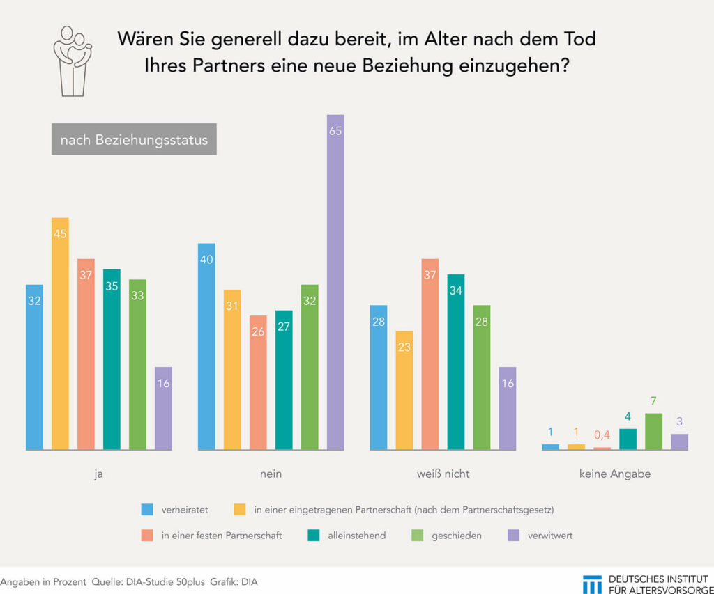 Leichte Verschiebungen in den Einstellungen zu dieser Situation ergeben sich mit zunehmendem Alter. So zeigen sich die unter 50-Jährigen mit 38 Prozent etwas mehr geneigt, sich auf einen neuen Partner einzulassen, als die Befragten ab 50 Jahre (27 Prozent). Erklärungen für diese Zwiegespaltenheit sieht die DIA-Studie 50plus in gesellschaftlichen Konventionen und im individuellen Umgang mit Trauer. Diese zwischenmenschliche Dimension stützt auch der Fokus auf den Beziehungsstatus der Befragten. So lehnen immerhin 65 Prozent der Verwitweten eine neue Beziehung nach dem Tod ihres Partners oder ihrer Partnerin ab. Nur 16 Prozent aus dieser Gruppe zeigen sich für eine neue Beziehung offen.