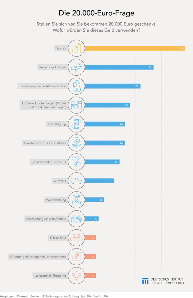 Nicht bei Günther Jauch, sondern im DIA-Deutschland-Trend wurden Antworten auf die 20.000 Euro-Frage gesucht. Stellen Sie sich vor, sie bekommen 20.000 Euro geschenkt – was würden Sie damit tun? Wer vermutet, dass die Mehrheit den unverhofften Geldsegen mit leichter Hand sofort ausgibt, liegt falsch. 39 Prozent wollen das Geld sparen. Das ergab eine repräsentative Befragung, die das Meinungsforschungsinstitut INSA Consulere im Auftrag des Deutschen Instituts für Altersvorsorge (DIA) durchführte. An zweiter Stelle, aber deutlich hinter dem Antwortfavorit „Sparen“, folgt die Finanzierung einer Reise oder eines besonderen Erlebnisses. Diese Verwendung gaben 27 Prozent an. Dahinter folgt auf Rang 3 die Finanzierung einer ergänzenden Altersvorsorge (22 Prozent).