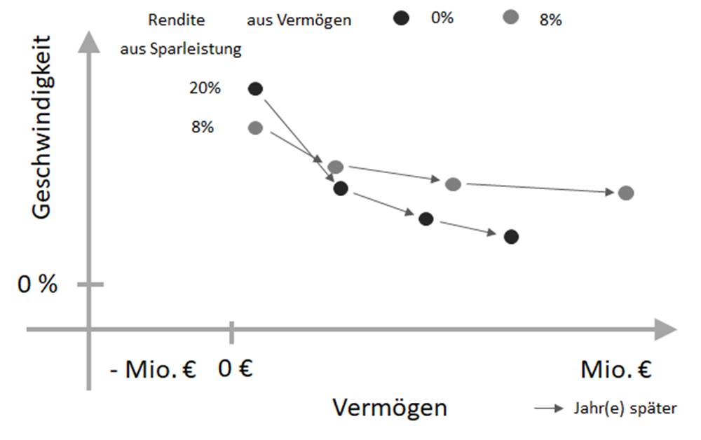 Wichtig: Die Geschwindigkeit nähert sich mit steigendem Vermögen immer der Geschwindigkeit aus dem Vermögen an, hier entweder 0 % oder, besser, 8 %.